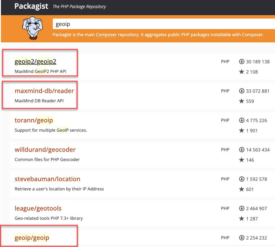 排名靠前的. geoip2/geoip2,maxmind-db/reader, geoip/geoip 是官方提供的安装包,其中 "geoip/geoip". Abandoned,转到了 geo2/geoip2,